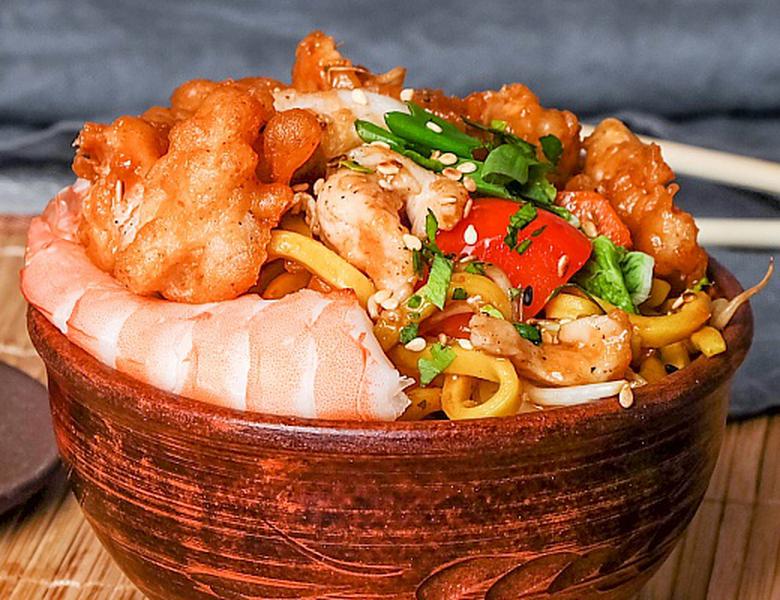 Состав: Яичная лапша удон, нежное мясо цыпленка, креветка тигровая, соевые ростки, пекинская капуста, морковь, перец болгарский, кунжут, зелень.