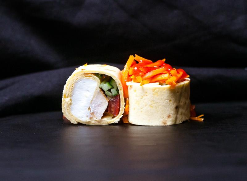 Состав: Тортилия, сыр творожный, огурец, курица копчёная, помидор, корейская морковка, соус острый